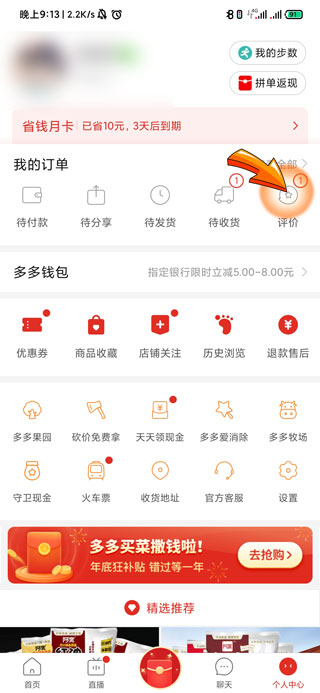 1、拼多多查看评论首先需要打开拼多多APP,点击首页右下角的“个人中心”图标。