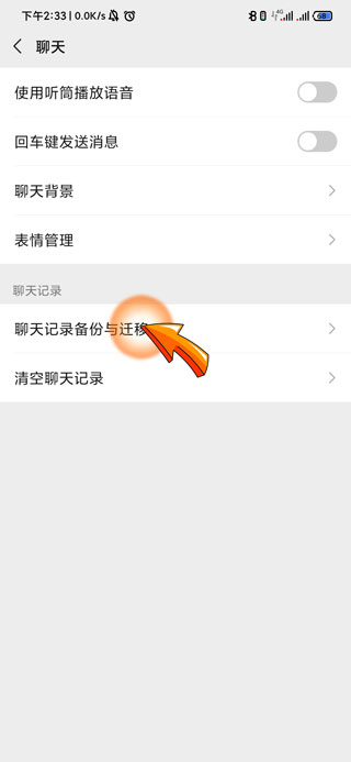 4、进入聊天页面后,点击“聊天记录备份与迁移”选项。