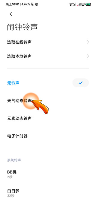 5、最后点击有声音的铃声选项,例如点击“天气动态铃声”选项即可。
