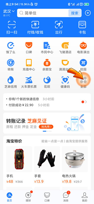 1、支付宝查电费账单明细首先需要打开支付宝APP,点击首页中的“全部”图标。