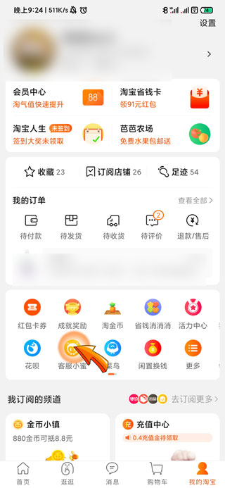 2、然后点击我的淘宝页面中的“客服小蜜”选项图标。