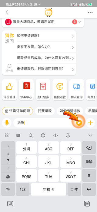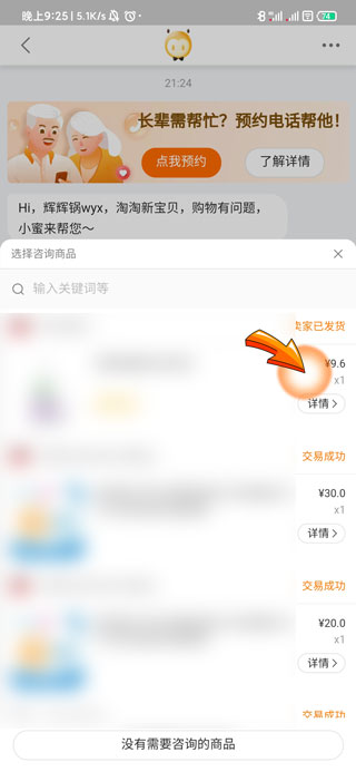 3、向客服小蜜发送“退货”文字,此时页面下方会弹出最近订单。