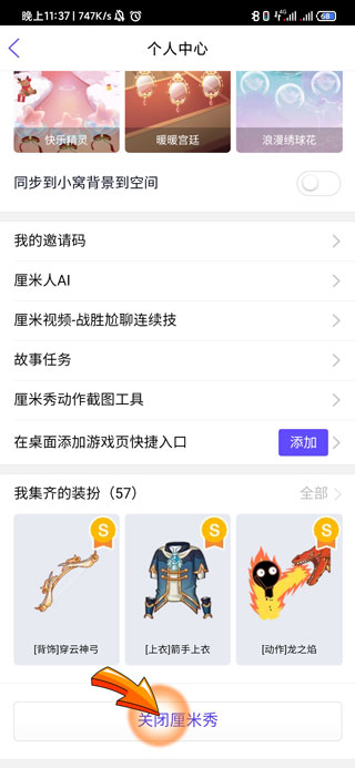 4、最后将页面滑至最底部,点击“关闭厘米秀”选项即可。