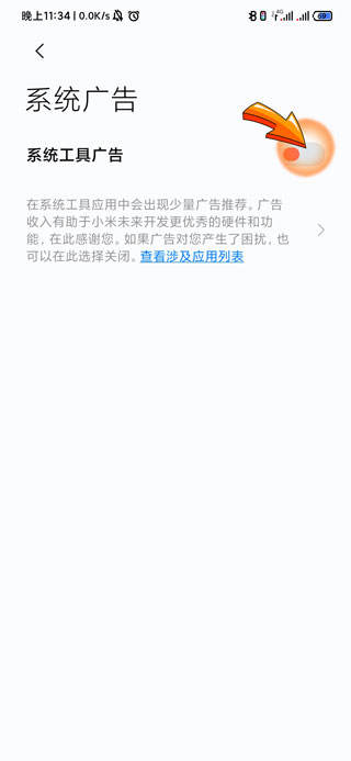 4、最后点击打开“系统工具广告”右侧的开关按钮,即可屏蔽广告。