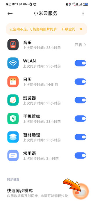 5、将小米云服务页面滑至底部,点击打开“快速同步模式”右侧的开关即可。