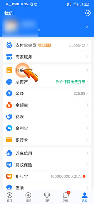 支付宝零钱明细删除记录需要打开支付宝APP,点击页面右下方的“我的”选项,然后点击“账单”选项,找到需要删除的“订单”选项,长按订单弹出“删除”窗口时,点击“删除”选项即可。