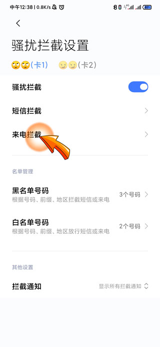 2、然后点击下方弹出窗口中的“骚扰拦截”选项图标。