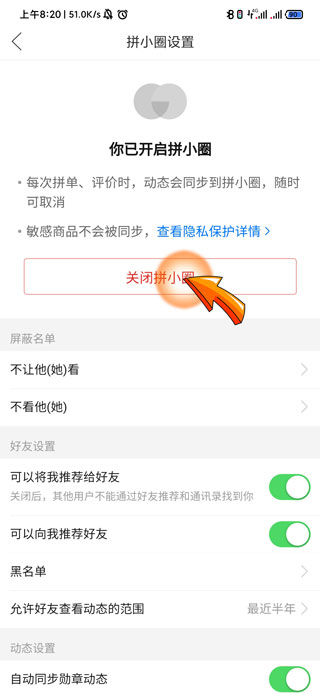4、最后点击“关闭拼小圈”选项即可使别人无法查看自己购买的商品。