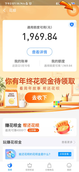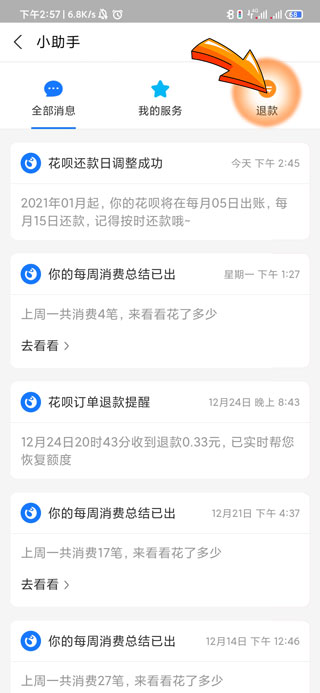 4、最后点击页面右上方的“退款”图标,即可查询淘宝退款到花呗的到账信息。