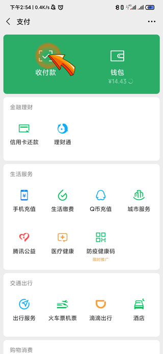 3、最后点击支付页面中的“收付款”图标,再将手机出现的付款码对准公交车的读卡器,即可支付车费。