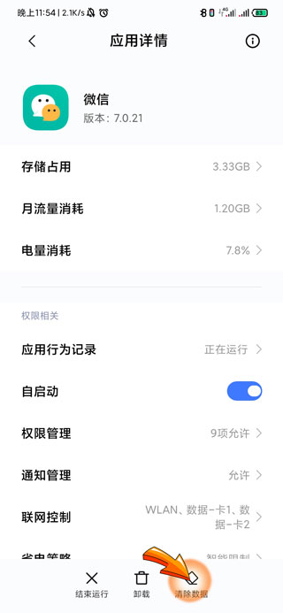 5、最后点击微信应用详情底部的“清除数据”选项,再打开微信进行尝试。