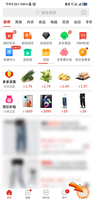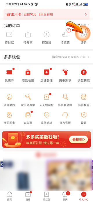 1、拼多多追加评价首先需要打开拼多多APP,点击页面右下角的“个人中心”选项。