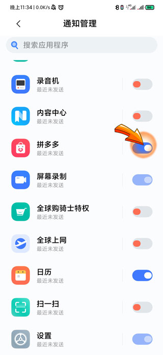 4、在通知管理中找到并点击管理“拼多多”右侧的开关按钮,就可以屏蔽拼多多的消息提醒了。