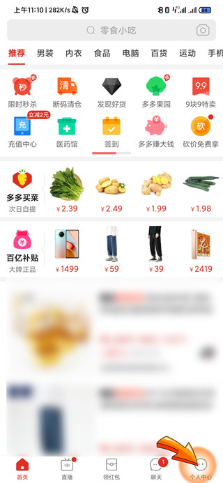 1、拼多多订单审核中需要打开拼多多APP,点击首页右下角的“个人中心”图标。