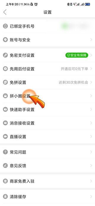 3、进入设置页面后,点击“拼小圈设置”选项。