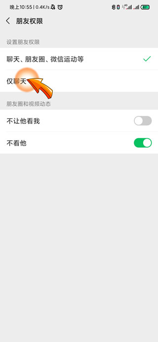 3、最后将朋友权限设置为“仅聊天”即可,也可以设置为“不看他”或者“不让他看我”等权限。