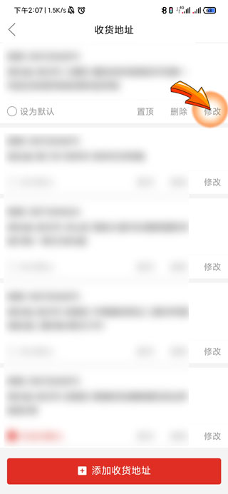 3、在收货地址页面中找到需要修改的地址,点击地址右下角的“修改”选项即可修改地址和电话。