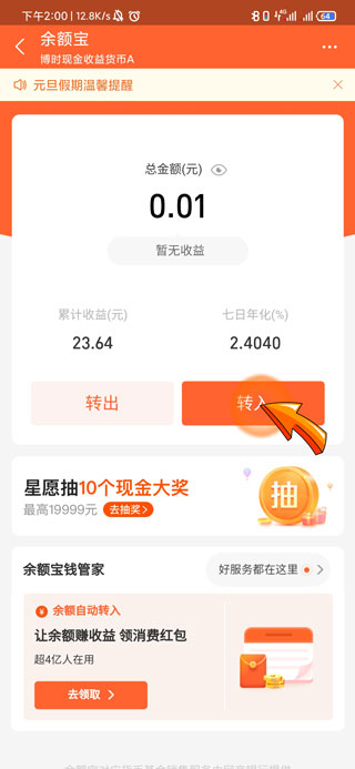 支付宝余额支付额度是20万每年,超过上限无法解除,但是可以将金额转入余额宝、银行卡等,就可以继续进行支付了,支付宝余额转入余额宝需要打开支付宝,进入余额宝页面后进行转入。