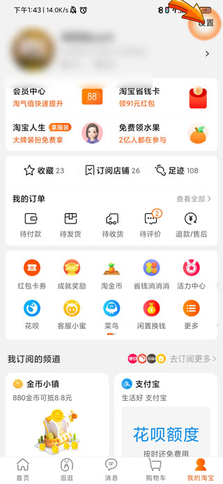 2、然后点击我的淘宝页面右上角的“设置”选项。