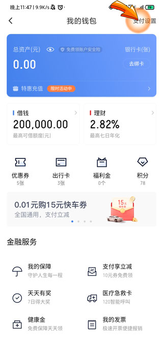 3、然后点击我的钱包页面右上角的“支付设置”选项。