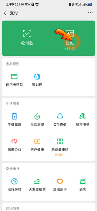 3、在支付页面中,点击“钱包”图标。