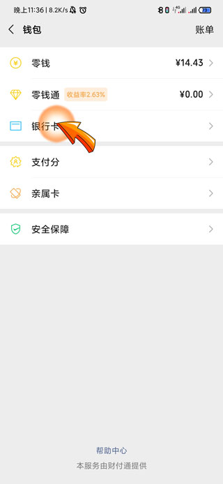 4、再点击钱包页面中的“银行卡”选项。