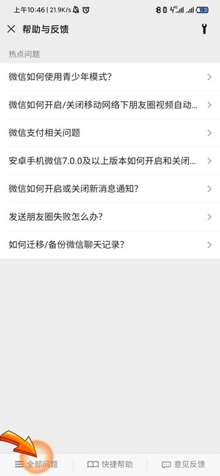 4、之后在帮助与反馈页面中点击左下角的“全部问题”选项。