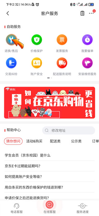 3、进入客户服务页面后,点击自助服务下方的“退还/售后”图标。