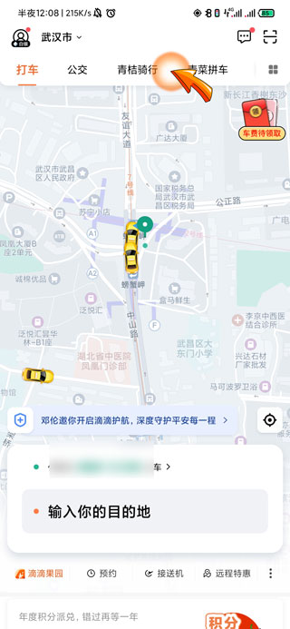 1、滴滴代驾首先需要打开滴滴出行APP,然后将手指放置“青桔骑行”和“青菜拼车”中间的空白区域。