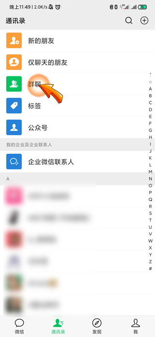 1、微信退群首先需要打开微信APP,点击通讯录页面上方的“群组”选项。