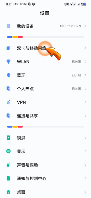 2、然后点击设置页面中的“双卡与移动网络”选项。