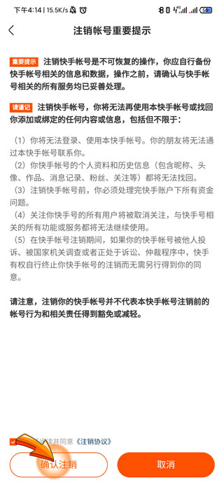 6、最后点击“确认注销”选项,快手账号就注销成功了。