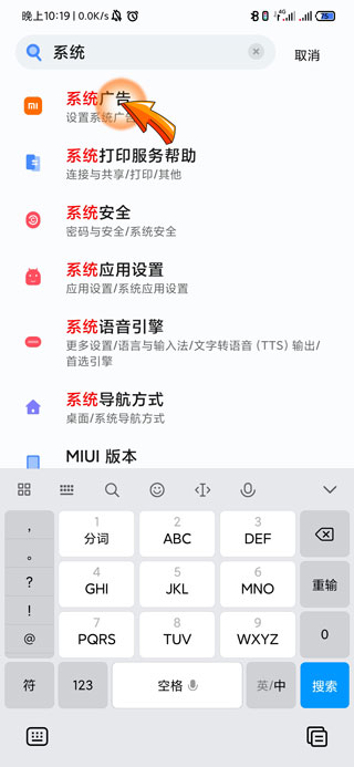 3、在搜索栏中输入“系统广告”文字,并点击页面下方出现的“系统广告”选项。