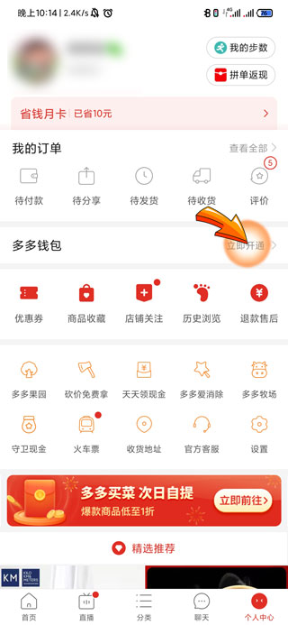 2、在个人中心页面中部有多多钱包文字,点击右侧的“立即开通”选项。