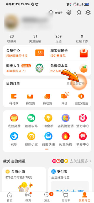 2、在我的淘宝页面中部,有“我的订单”选项,点击其右侧的“查看全部订单”选项。