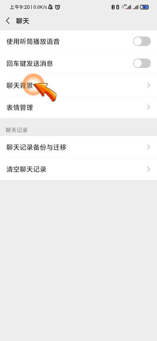 4、进入聊天设置中后,选择并点击“聊天背景”选项。