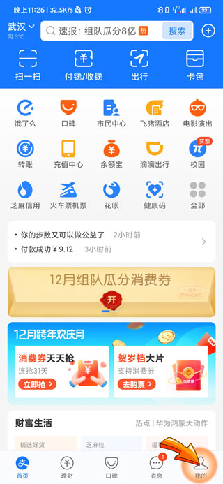 1、支付宝自动扣款关闭首先需要打开支付宝APP,点击右下角的“我的”图标。