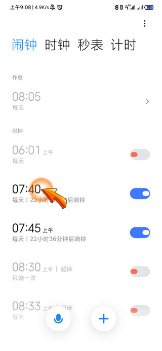 2、进入管理闹钟页面后,点击需要设置的闹钟“时间”数字。