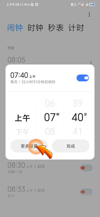 手机关静音了闹钟还是不会响,若需要关闭闹钟铃声,先要打开手机桌面上的“时钟”图标,然后点击需要设置的闹钟“时间”数字,在弹出页面中点击“更多设置”选项,再点击“铃声”,最后点击“无铃声”即可。