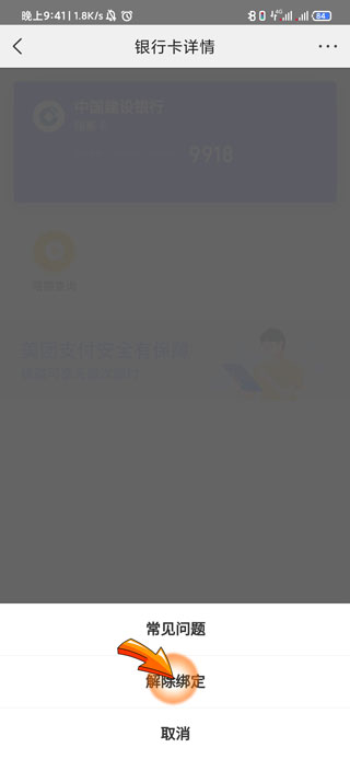 解绑美团支付银行卡需要打开美团APP,点击右下角“我的”图标,然后点击“进入钱包”选项,再点击“银行卡(张)”选项,点击需要解绑的“银行卡”图标,之后再点击一次,在点击“解除绑定”后,点击“仍要解绑”,再点击“仍要解绑”。