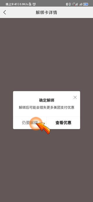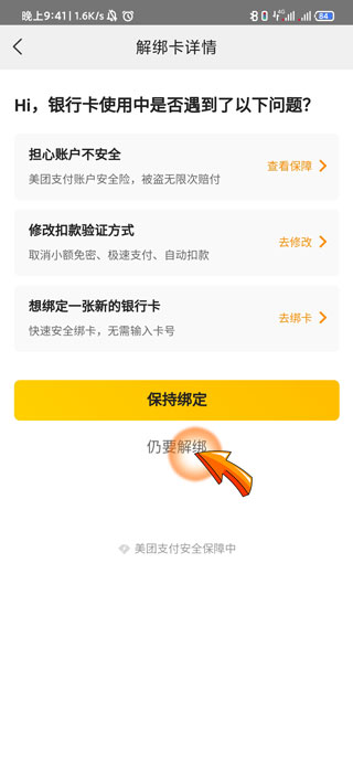 8、最后系统会询问是否确定解绑,点击“仍要解绑”即可解绑美团支付银行卡。