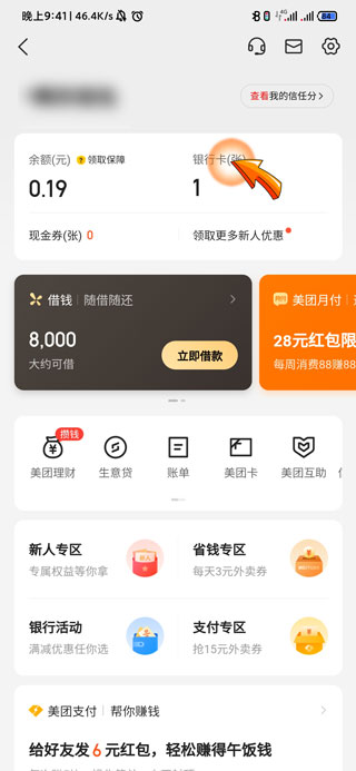 3、在我的钱包页面中,点击“银行卡(张)”选项,查看银行卡。