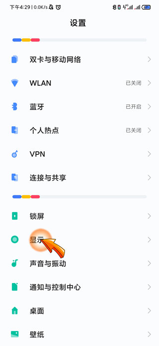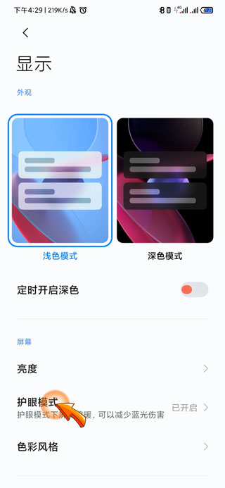 手机右上角出现眼睛图标表示手机开启了护眼模式,如果需要关闭可以打开手机“设置”,找到并点击“显示”选项,然后点击底部的“护眼模式”,进入页面后点击“护眼模式”右侧的开关即可。