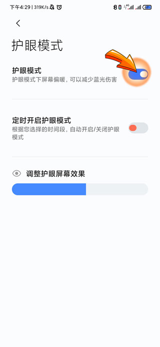 4、进入进入页面后,点击“护眼模式”选项右侧的开关,即可将手机护眼模式关闭。