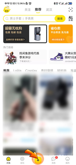 1、闲鱼上卖东西首先需要将手机上的闲鱼app打开,进入闲鱼页面后点击底部中间的“加号”图标。