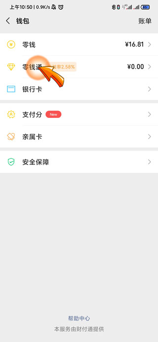 3、再点击支付页面的“钱包图标”,进入后找到“零钱通”选项。