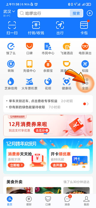 1、支付宝蚂蚁森林开启步数首先需要将支付宝app打开,在支付宝首页中点击“全部”图标。