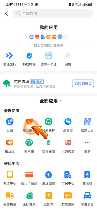 2、然后在页面中找到并点击“爱心捐赠”图标,进入爱心捐赠页面。