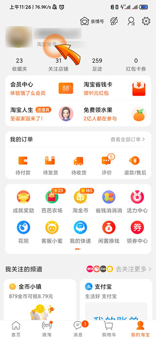 2、之后在页面的顶部会有头像和淘宝昵称,在淘宝昵称的下方有“淘宝账号”文字,而在文字后的名称就是淘宝id。