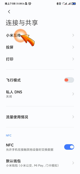 两个小米手机互传软件需要同时打开手机桌面上的“设置”图标,进入后点击“连接与共享”,然后点击最上方的“小米互传”选项,在出现的页面中打开“小米互传”右侧的开关,然后手机就对检索到对方手机,就可以互传软件了。